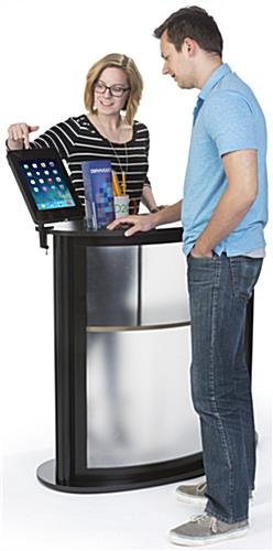 This kidney shaped counter with iPad stand is the perfect furniture display for your next trade show event. Included in the set are 2 PVC lenses and an attaching tablet holder for extensive product promotion. The counter with the locking tablet enclosure also includes a set of keys to keep your device safe from theft and damage. While presenting and interacting with expo attendees you can keep additional items tucked away in the furniture’s floating shelf. When you’re done with your display for the day, just pack up the counter into the provided carrying bags and make your way to your next appearance. When you’re done for the day, use these promotional counters to demonstrate products or hand out literature and samples at your next trade show event!