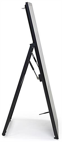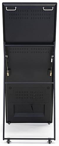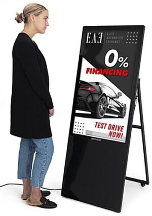 This digital sandwich board is a sleek advertising signage solution for your retail store, café, car dealership, trade show, and more! This modern A-frame has an Android 7.1 OS and a 1080p 43″ screen, providing you with a high-quality display for your in-store promotions, menus, product videos, and more. This portable digital sandwich board has a collapsible piston hinge design making it easy to store away and move around. The back of the A-frame unit features two wheels on the base and handles on the top for simple maneuverability around larger spaces like department stores and convention centers. Access your content with ease with USB, HDMI, WiFi, and Bluetooth options, making it easy to access content on a computer, hard drive, or in cloud storage. Instantly improve your picture’s or video’s exposure, saturation, highlights, and more using the pre-installed DiViEX Slide Show App for an elevated advertising signage experience. This portable design also features casters and rubber foot pads, keeping the unit firmly in place in high traffic environments. This collapsible digital sandwich board will elevate your store’s advertising with impactful multi-media content that will effortlessly grab passerby’s attention.