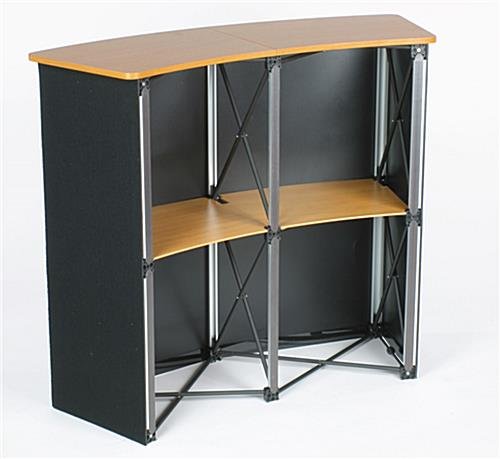 This portable counter features a pop-up frame with magnetic connectors that snap into place when expanded. Blackhook & loop receptivefabric panels attach with magnets to cover the frame, and provide a display space for a variety of accessories. Attach any combination of literature holders, sign frames, and posters easily with hook and loop fasteners. The top counter and internal shelves are made out of MDF with a wooden finish for a durable, yet attractive display.