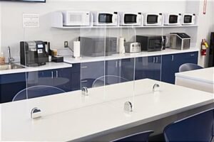 This sneeze shield table divider is an excellent solution for corporate offices, restaurants, bars, cafes, or classrooms. Collaborate with your classmates or coworkers in a safe and sanitary way that promotes you to continue following social distancing guidelines. The overall dimensions of this clear multi-section acrylic barrier is 44″L x 22″W x 20″ H, providing plenty of protection with little obstruction of view. The 4 silver metal footings have an internal soft touch tension grip and can be easily removed for access to center hole to provide hard mount options. This 0.1875″ thick sneeze shield table divider will enhance the health and wellness in your office or restaurant and bring ease to your employees and customers alike.