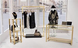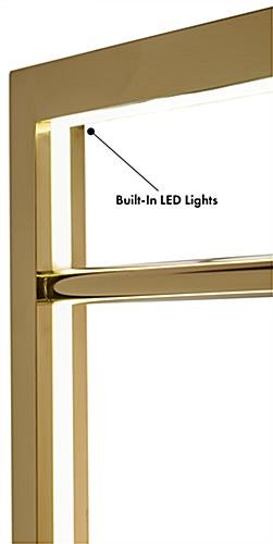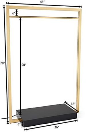 Our modern metal clothing rack has an eye-catching shiny gold finish and sleek ebony base that will add a contemporary touch to any retail store or boutique space. This freestanding garment display has overall dimensions of 46″ W x 18″ D x 70″ H providing ample space for clothes. Each gold modern metal clothing rack features built-in warm LED lights recessed into the frame, allowing you to illuminate your showcased items perfectly. The power cord is 54″ long and features a 3-prong plug design. This minimalist garment display has an overall weight capacity of 155 pounds, making it easy to showcase a wide range of products at once. The warm LED lights will help retail stores create a moody and eye-catching display that will draw customers in effortlessly. Pair this freestanding modern metal clothing rack with SMOFCPT and SMOFCCT for a well-rounded store exhibit that will lend a contemporary feel to your store.