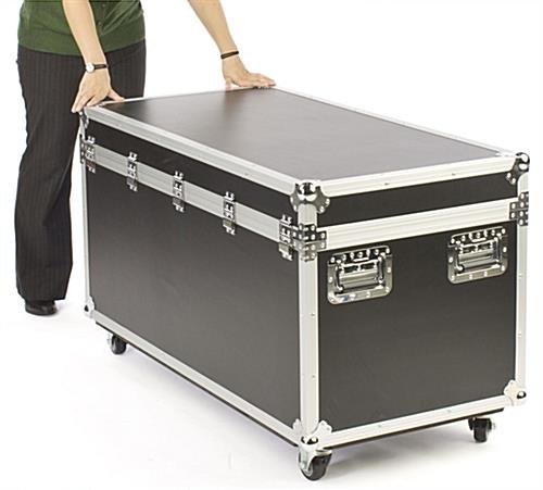 Shipping cases with wheels are meant for transporting trade show accessories or supplies to and from an event. This equipment container, hard carrying case is made from 3/8″ plywood and features black, fireproof ABS paneling for added durability. Although not ATA regulated, the hard carrying cases, such as shipping cases with wheels, are equipped with chrome-plated, rust-resistant ball corners as well as two heavy-duty, chrome-plated handles. We also provide the hard carrying case with two butterfly latches to keep your case securely closed during travel. There are even rings through which you can attach a lock or security strap.