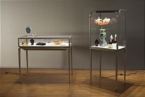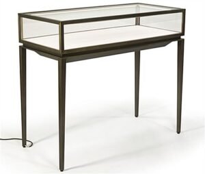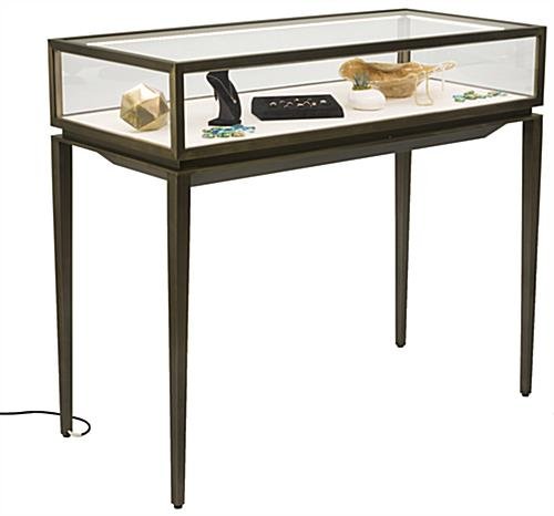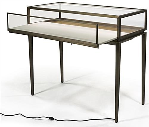This modern jewelry display table is an effective way to showcase high end and expensive retail items. Necklaces and bracelets laid out in trays or earrings presented in holders behind the tempered glass case are beautifully engulfed in LED lighting for a dramatic store fixture composition. Accessing boxes or merchandise from this lockable display table is made easy with the rear slide-out drawer opening that allows employees to secure and step away to assist clientele. Gem stones and gold rings will flicker and come to life beneath the illuminated case, while the cream leatherette base interior offers a neutral palette for trays or loose fashion items. Adjustable floor levelers and a power cord exiting from the rear tapered leg provide the fundamentals for a stable store fixture without an unsightly construction. Brushed stainless steel framing is finished with a bronze lacquer coating for a timeless design for each display table that is sure to withstand years of well-earned use.