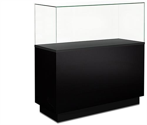 This frameless glass display cabinet features a modern black base made of eco-friendly FSC-certified CollinsWood®. The counter features a 17″ tall break-resistant, tempered glass lift-off top with a keyless air cylinder pneumatic locking system that does not require an electrical outlet. This locking system seals the top onto its base, keeping it tightly secure and locked, perfect for high-end retailers and museums. The stunning showcase is airtight and dust resistant, with silica gel bags in lockable compartments to ensure preservation and protection from moisture. With dimensions of 48″W x 47″H x 20″ D, this luxury fixture is an excellent option for showcasing high-end collectibles and valuable merchandise items in jewelry stores, galleries, or museums. The unit has a beautiful laminate finish, levelers for uneven floor surfaces, and a 4″ toe kick, creating a clean, polished look at its base. This exquisite frameless glass display cabinet is a showstopping piece that will attract customers to your featured items in any gallery exhibit, showroom, lobby, or retail store.