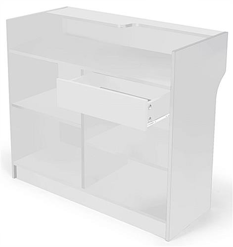 This white ledge counter has an elevated shelf on which customers can rest while writing checks and making payments. The extended surface also works to display advertisements and other POS paraphernalia. This white ledge counter measures 48 inches wide. An open shelving area is located on the backside, with 2 height-adjustable shelves to accommodate items of varying heights. There is also a pull-out drawer for additional storage. This white ledge counter is constructed from laminated particle board, which is more affordably priced and weighs less than solid wood.