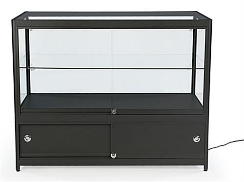 This LED retail store counter is the ideal cabinet for jewelry boutiques, museums, or collectible shops. The glass display includes 1 tempered panel shelf which makes it strong enough to hold items that are heavier in weight. The knockdown store counter ships unassembled to reduce shipping costs for the consumer. Illuminate your jewelry with the 4 energy efficient side lights for a longer lasting glass display. The sliding display and storage doors give you easy access to your items within the store counter. Add this beautiful display cabinet to attract consumers and showcase your high end items!