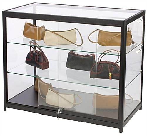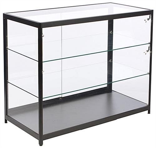 This aluminum display case counter is great for jewelry, pocketbooks, or memorabilia. The cabinets include 4 LED side lights for a more eco-friendly way to illuminate your merchandise. The tempered glass display counter also has 2 adjustable shelves to accommodate items that are larger in size. To adjust to uneven surfaces the cabinets are equipped with foot levelers to maintain a stable structure. The display counter includes sliding tempered glass doors with a key entry push-in lock to keep your items safe from theft. Place your jewelry in the curio to bring attention to your store and to show your customers which items are featured!