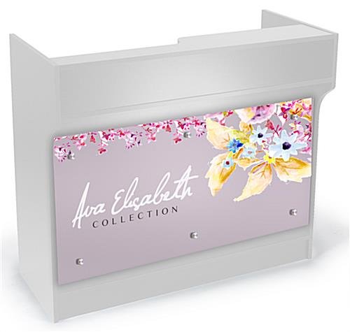 Now available with custom UV printed artwork, this 4’ ledge counter with graphics is a great marketing tool for any retail store. Each personalized display cabinet is sold with a 46”w x 27.125”h panel which can be paired with silver standoffs to best suit the color & design of your company’s logo. The floor standing ledge counter is available from the exclusive Ava Elisabeth Collection offered from this online catalog. Each unit is crafted from durable white melamine and comes with an acrylic panel to be fastened to the cabinet with the provided standoffs. Creating artwork for your ledge counter is easy! Simply follow the guidelines provided on this page and upload your design!