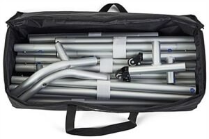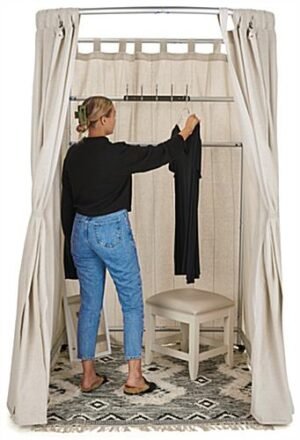 Our mobile fitting room frame is a convenient solution for businesses on the go like pop-up shops, trade shows, medical testing sites, and more. The base features four locking caster wheels for maximum mobility, allowing you to move the unit quickly and lock it firmly in place when in use. This portable mobile fitting room has a 48″w x 60″d x 84.5″h freestanding design, providing ample space inside for a comfortable customer experience. The inside of the unit features five built-in hooks providing the perfect space for hanging clothing hangers, purses, jackets, and more! This freestanding booth with wheels has a 1.25″ pole diameter, making it easy to add a wide range of curtains from rod pockets to tie tops. The aluminum pole pieces are conveniently numbered for ease of set up and have a button spring clip assembly that requires no tools. The poles collapse in minutes and fit in a convenient carrying case great for travel and storage. Our portable mobile fitting room will make it easier than ever to create privacy in any pop-up shop, medical or event space!