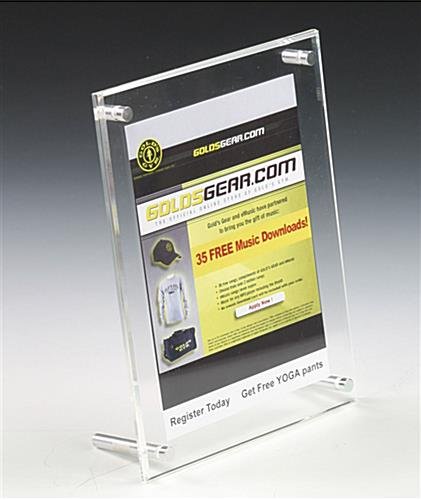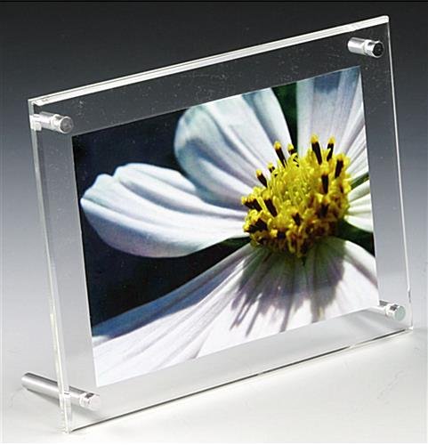 Acrylic Picture Frames, such as these clear sign holders are fabricated from two acrylic panels and each measures 1/8″ thick. Four metal binding screws hold the image in between these two clear panels tightly. These acrylic picture frames provide an easy way for you to change photos, either portraits or landscapes.