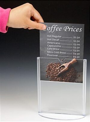 Each menu sign holder, table tent features a mold-injection plastic construction. Due to the plastic fabrication, this unit is more affordable than merchandise manufactured from acrylic, wood, or metal. The table tent that is made from plastic has a lightweight as well. Each unit has a frame that is completely transparent, making this a double-sided menu card holder. These countertop sign frames are perfect for advertising on a centrally located counter or tabletop, as they provide maximum visibility for advertisements. Menu cards simply slide into the top of the frame. There is a thumb notch at the top of the menu card holder which allows users to quickly remove old inserts.