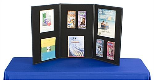 This tabletop exhibit is a great addition to any trade show display! The presentation board, tabletop exhibit has a 3-panel design, providing you with an adequate amount of space for displaying signs, posters and literature-holding accessories. This tabletop exhibit, also known as a folding panel board, has black, hook and loop receptive fabric and magnetic capabilities to make adding signage and accessories effortless. (View the right-hand-side of your screen for acrylic, hook and loop based products.) You can customize your presentation by simply rearranging your accessories!