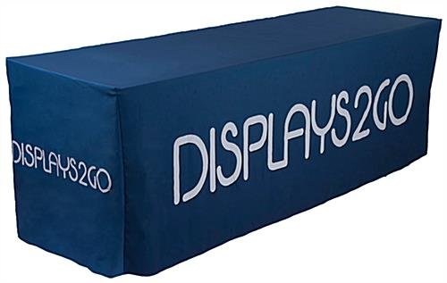 This custom fitted tablecloth allows you to have your logo printed on crease resistant polyester fabric, giving you the stand out factor you need at any trade show or convention. With a graphic area that is full bleed, a means to properly promote your brand in the most professional manner is made possible. The designable fitted tablecloth equipped with a back zipper to ensure concealed storage is meant to fit 6’ rectangular tables. With full color printing, your logo will come to life like never before. This fitted tablecloth is also wrinkle-resistant, with corner seams, to keep the table covers in place. A dye-sublimation printing technique provides you with a high quality item to promote your products at your next trade show.