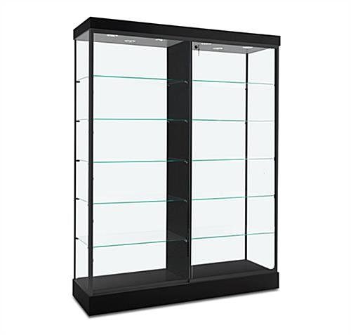 These glass cabinets are oversized to display many products at once! The display cases, glass cabinets are designed for use in museums, retail stores, business lobbies and much more. Glass cabinets are ideal for stores or other commercial environments looking to buy a minimum number of cabinets, whether for financial or spatial reasons. These glass cabinets offer multiple levels to hold your entire product collection. These glass cabinets feature a black base and canopy. Items such as gold or silver jewelry, glass collectibles, trophies and other fine merchandise look stunning in these glass cabinets with black laminate accents.