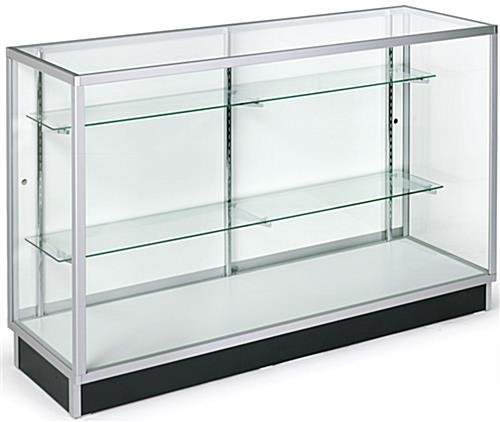 The display case, glass cabinet measures 60″ wide by 38″h (standard retail counter height), by 20″ deep. A 4″ high kick plate protects your cabinet from foot traffic damages. All glass surfaces of the cabinet are constructed from tempered glass. A tempered glass display cabinet is a much safer choice for busy retail environments than traditional annealed glass cabinet. The cabinet is less apt to break in busy environments, and if it does, it will break into small, manageable pieces, rather than large, dangerous shards. Clear-coated aluminum extrusions add a classy touch, while providing more stability than plastic extrusions. Sliding doors allow easy access to displayed items, while a plunger lock ensures only authorized persons may have access to the cabinet.