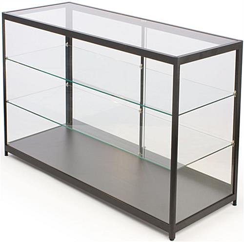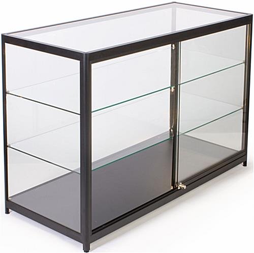 These store fixtures, jewelry counters that are in stock are built from quality materials, creating a case that will last for many years to come! Black powder-coated aluminum extrusions provide the framework for tempered glass panels. The jewelry counters attract attention, even without inside lighting! Adjustable floor levelers ensure the cases are stable on virtually any surface. The cabinets include full-height, half-width rear doors with a plunger lock. This allows employees to easily retrieve an item that a customer may be interested in. This unit is part of a full line of counter displays. The Essentials Line offers retailers a centralized area to display merchandise and encourage customer/associate interaction, which can often increase sales. Users can purchase multiple pieces of this line to create an entire configuration! There are even many styles available with interior lighting! All Essentials Line cabinets ship fully assembled for your convenience!