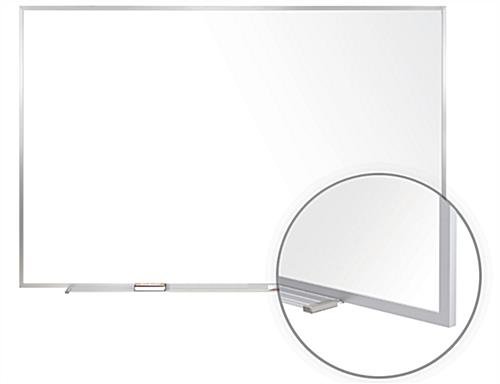 This erasable markerboard is 60″ wide x 48″ high and has a satin aluminum frame. This board is designed with everyday use in mind. The porcelain surface resists scratching, denting, or staining. The porcelain surface is on a steel substrate which can accommodate Neodymium core magnets sold separately. This erasable markerboard includes a black marker, an eraser, and a tray with protective end caps. Board hangers are included. Mounting hardware of your choice is required depending on the wall surface.