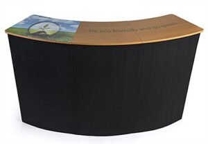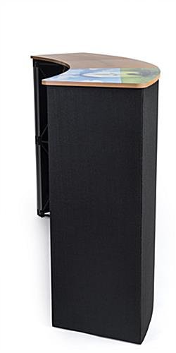 This pop up custom counter will bring your booth to life! A UV-printed top makes this curved, lightweight display stand the perfect way to showcase your products and your logo, side by side. With the included rolling case, this portable custom counter easily moves with your booth. The curved surface creates a natural, inviting look, and built-in shelving allows you to store extra products or personal items out of view. The hook-and-loop-receptive faces allow you to swap out graphics on the fly. This custom counter makes a great display stand that’s sure to unify the presentation of your brand!