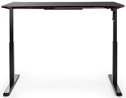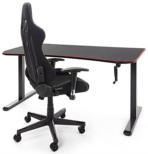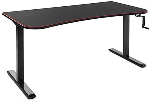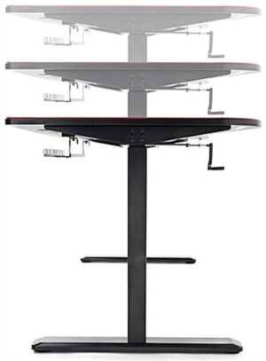 This ultra-wide adjustable computer desktop provides plenty of display space, perfect for your serious working, studying, and gaming goals. Each ergonomic sit-and-stand table’s surface is uniquely covered by an edge-to-edge high-quality neoprene mat that will remain in place during long hours of mouse operation. This matte black adjustable computer desktop with 63″ wide x 31″ deep desk board features a tapered edge design that places you closer to the monitor and provides pressure reduction to reduce forearm fatigue from hours of working or gaming. Choose between sitting or standing by using the detachable hand crank for height options from 29.5″ minimum to 48.8″ maximum. The durable t-shaped steel legs on this adjustable computer desktop adheres to the matte black particle board table top resulting in a heavy-duty fixture that can withstand up to 110 pounds. Additionally, a built-in concealed cable management system keeps your area distraction-free and unruly cords neatly in place. It’s time to level up with our high-quality ergonomic sit-and-stand desk that is sure to place you in the perfect position every time!
