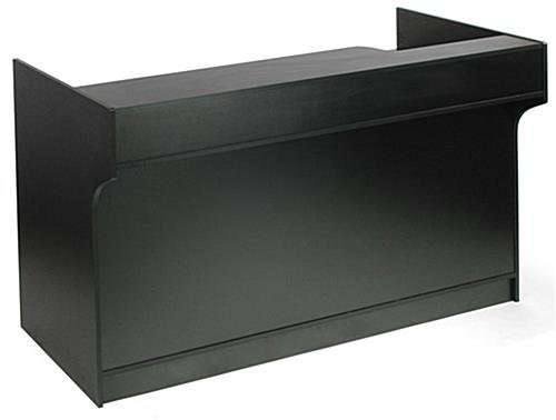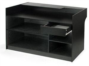 This black retail counter is great for handling transactions in a wide variety of stores. The cash wrap stand features a pull-out drawer for storing cash boxes, merchandise bags, extra receipt paper, and writing utensils nearby. This melamine retail counter also features a large ledgetop that gives customers room to place their phones or handbags during checkout. In addition, the cash wrap has a recessed well to conceal unsightly computer and electrical cords to reduce clutter. The sales counter has a large area for further storage, featuring two adjustable or removable shelves to hold merchandising supplies. Choose this 72″ wide cash register stand to create an attractive checkout area for your business.