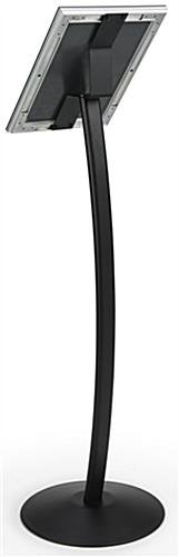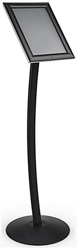 Alternative to traditional poster displays, this angled pedestal sign features a sleek curved post. Suitable for 8.5” x 11” prints a UV-protective PVC lens protects media within the locking snap frame. An interior magnetic strip transforms the floor stand into a weatherproof angled pedestal. Helping maintain a durable integrity, the aluminum build features a weather and rust resistant design. Each poster holder display offers an angled pedestal capable of keeping up with quick advertising updates. Keep your marketing efforts protected with an outdoor floor stand designed to endure the elements!