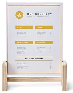 This 8.5″ x 11″ wooden countertop sign holder is an ideal signage solution for showcasing promotional advertisements, brand messaging, product pricing, inspirational photography, and more. Made of sustainable polycarbonate, this slanted poster frame is constructed of a lightweight poplar wood base with an eco-friendly laminate finish. This clear wooden countertop sign holder has a bottom insert loading style that allows for quick and easy signage updates as your brand’s messaging changes over time. Each slanted sustainable fixture with knockdown design is easy to assemble and disassemble in seconds without the use of any tools. Effortlessly carry this wooden countertop sign holder within the included flat-pack case for easy transport in between traveling events such as pop-up shops, trade shows, craft fairs, or art festivals. Place this eco-friendly polycarbonate poster frame with wood base in retail stores, boutiques, market booths, and more to update outdated signage and make sure your promotional advertising and messaging stands out amongst any crowd!