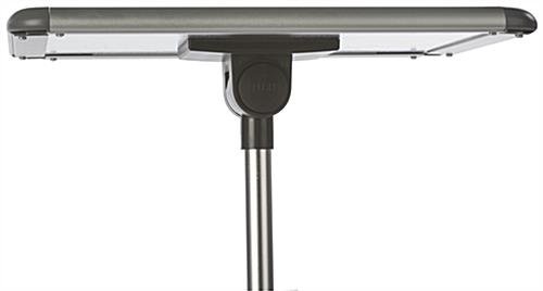 This 8.5 x 11 silver snap frame stand is a front loading display for posters and signs. Help promote products and services in lobbies, stores, and trade shows with this pedestal style fixture. This poster snap frame stand is fixed in a vertical orientation. Adjust the viewing angle by pressing the button on the mount and locking in place when the sign is tilted at a desired position. The weighted base prevents the snap frame stand from tipping over; while the aluminum construction keeps it light enough to easily move around a store. Effortlessly rotate between graphics for every season and event with this front loading advertising display.