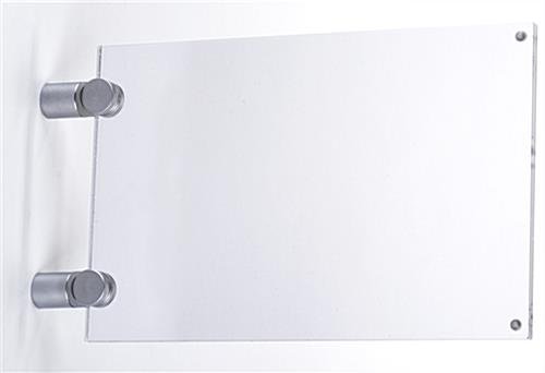 This office door sign is made from clear acrylic and designed to display double-sided custom signage. Included with these frames is a set of two silver standoffs for wall mounting. Many users hang the 8.5” x 5.5” door sign outside conference rooms or use them as name plates. Additional uses for the frames include posting wayfinding signage or safety information. Updating your graphics is quick and easy with this door sign – just gently pull apart the magnetic closure and insert your new custom signage! Once finished, the magnets will keep your graphics in place! From labeling conference rooms at large corporate headquarters, to posting classroom numbers in schools and universities, the uses for these frames are endless!