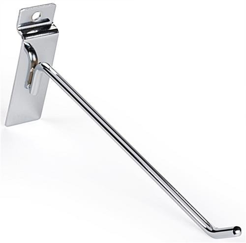 Set up an organized slatwall fixture by hanging merchandise in your shop with this 8” chrome display hook for slat panel. Each metal peg is crafted from heavy duty material to ensure long lasting use supporting a variety of products. An angled tip ensures snacks and accessories stay on the glossy chrome display hook for slat panel without falling off.