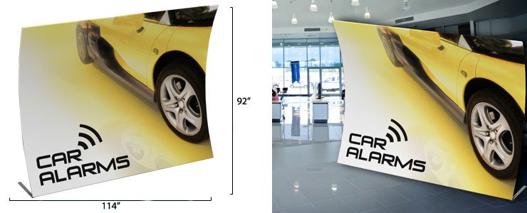 This trade show graphic stand is designed for positioning at the rear of a demonstration. The backdrop exhibit measures just less than 10 feet wide and features a vertical curve. This trade show graphic stand, also known as custom-printed banner, is 92″ tall, which completely covers the entire backing of a booth. Illustrations are submitted after checkout and are reviewed by a customer service representative to make sure the designs match perfectly to the provided guide. These trade show graphic stands then go through a dye-sublimation printing process, creating 600 DPI images, which are brightly-colored and extremely detailed. The stretchy material, used to create these tradeshow backdrops, slides over top of the aluminum framing. The snug fit will pull your advertisements taut, eliminating wrinkles and folds.
