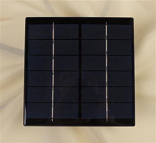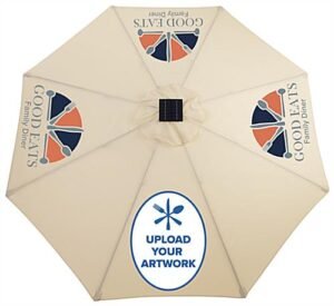 This commercial patio umbrella with custom printing makes a great addition to any outdoor bar, café or restaurant. The pre-installed lights charge during daytime hours using solar energy, which allows users to enjoy music from the built in Bluetooth speaker and an ambient glow at night. The simple tilting feature of this commercial patio umbrella makes for quick and easy adjustments help shield from the sun at any time of day. The heat transferred custom printed canopy allows you to add a personalized touch to your company’s external appearance with graphics on 4 of the panels. Powered completely by solar energy, these canopies don’t need to be placed by a power outlet to work. Our custom printed commercial patio umbrella will amplify your business, allowing music to be catered to each guest’s preferences with the built-in Bluetooth speaker feature.