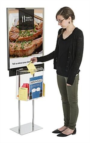 This floor standing poster with ballot box holds a 22” x 28” graphic within a double sided frame, as well as an 8.5” x 11” sign on the front of its acrylic collection container. Also on the sides of this large donation case are two smaller pockets, great for holding forms for suggestions or entries into a contest. Display graphics that will get noticed with this double sided poster with ballot box to draw attention to your collection efforts, whether you’re trying to get suggestions, donations, or raffle entries. Easily change out your large prints and the front pocket graphic to keep your sign holder up to date. Made from a clear acrylic material, this poster with ballot box is a great for showing off the success of your donation drive or contest. With its versatility, this sign holder can be used in settings ranging from community centers to trade shows to restaurants and more.