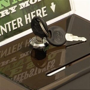 This item is manufactured from high-grade materials, as quality is a high priority. This suggestion box with lock that is constructed from acrylic has a dark, smoked acrylic base with a clear sign frame on top. The locking mechanism is conveniently placed at the top to ensure fast and easy removal of a ballot or donations. To access the contents, simply unlock the container with the key and remove the back header. The boxes feature a 3-1/2″ drop slot which is large enough to fit both coin and bill donations.