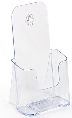 These plastic flyer holders, that are cheap, are also well crafted. Each unit includes an angled-back design, for optimal viewing. The high back ensures your literature will not flop over! These molded plastic flyer holders that sit on a counter, also called countertop brochure boxes, can also be wall mounted. Hardware is not included for wall mounting. However, any medium-sized screw or nail can be used to mount this literature pocket to the wall. These clear brochure boxes are designed to hold 4″ x 9″ tri-fold literature. Additional display pockets for 8-1/2″ x 11″ leaflets, as well as acrylic business card displays, are also sold here. Please see related products for more available options.