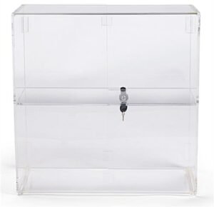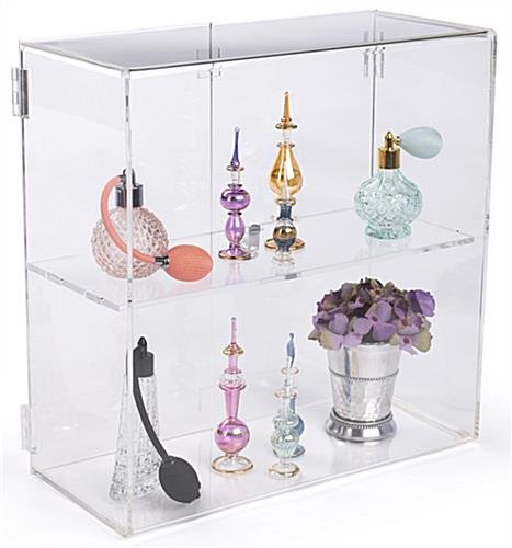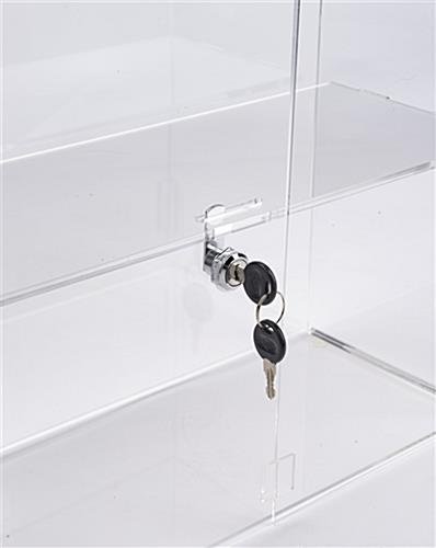 These countertop jewelry showcase displays, countertop display cases are crafted from crystal clear acrylic to offer an affordable alternative to real glass countertop showcase displays. Acrylic offers the same visibility as glass without the high cost and it is much more resilient to breakage! Countertop display cases feature a cam lock with a set of two keys to keep items safe. A shelf sits midway between the top and bottom of these countertop showcases to offer two levels of showcase space. Hinged doors open to allow full access to displayed items. These doors can either face customers or the store associate. Rubber feet keep these countertop display cases sturdy and prevent slipping on counter top areas. Why pay for custom countertop cases? We have a huge selection of stock cases available!