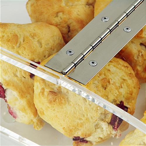 An acrylic food display features an acrylic construction with a long lasting stainless steel hinge. The clear exterior makes it easy to see any product placed inside the counter top display. An acrylic food display, sometimes called a bulk bin or bagel bin is perfect for use in a bakery. Baked goods are easy to load and unload into the curved bin. An acrylic food display is great for storage and display of items such as cookies, scones, and other smaller baked good. The 11″ x 3″ x 11″ dimensions are perfect for many different food items. This acrylic food display features superb craftsmanship, we have gone as far as to polish the edges of the display to help accent the product inside. A quality food display case!