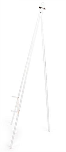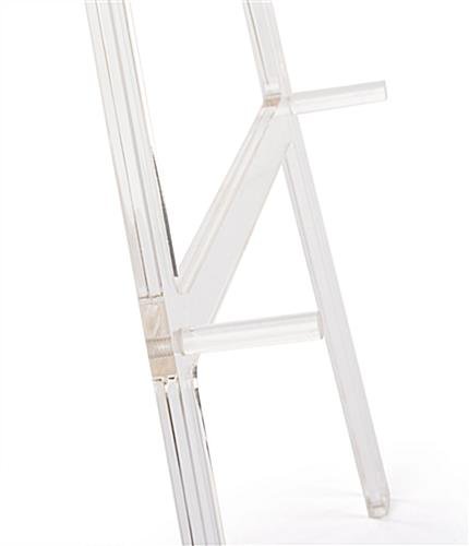 This acrylic A frame floor easel with a contemporary and transparent design disappears to float paintings, foam boards and wedding boards. The 48″ high tripod stand makes your art supplies and framed artwork the main focus of your studio and creates an elegant area for your guests to enjoy. Our lightweight and contemporary acrylic A frame floor easel easily folds flat for storage and quick transport – it also ships flat to keep the shipping cost low. Assembly is a 2 step process – simply screw the back leg to the triangle shaped frame and the tripod comes into shape. Featuring 2.5” pegs that are 13” off the floor, the transparent presentation holder can accommodate multiple sized literature, art supplies and framed artwork up to 9 pounds in weight. The acrylic A frame floor easel’s three legs create a sturdy structure that comes complete with anti-scratch rubber protectors to keep your studio floor from damage.