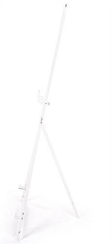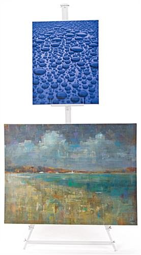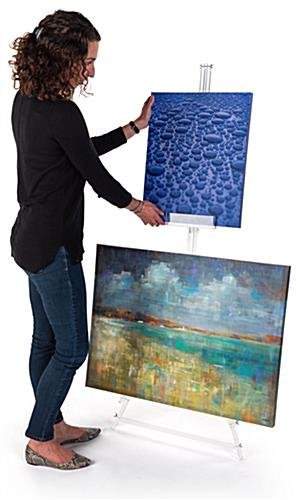 Our acrylic tripod easel features a height adjustable front tray and two bottom pegs to allow the user to display two framed artwork pieces simultaneously. The slim triangular modern design is constructed of high-quality material that creates a sturdy frame to create a stable exhibit. This sleek clear acrylic tripod easel for framed artwork and welcome announcements allows dual displays to optimize space. Featuring a folding back leg, the triangular clear exhibit folds flat to easily transport it from one place to the next. The modern and transparent display fixture will help to make welcome announcements and canvas prints the main focus of the space. Complete with rubber padding on each leg, the acrylic tripod easel will prevent floor scratching and will create a wobble-free presentation.