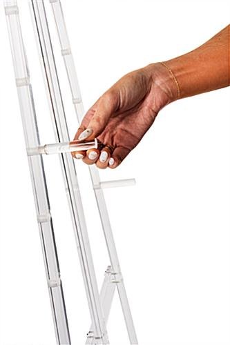 Our floor standing adjustable acrylic artist easel is constructed of strong transparent material to create a sturdy structure to display canvas prints, artwork, framed pictures and announcements. Weighing 22 pounds and featuring 2” thick acrylic, the portable tripod stand creates a stable fixture that will not easily tip over. The adjustable acrylic artist easel features twist on pegs along the front legs to allow the user to present different sized media at the perfect height. The lightweight floor standing tripod stand features a collapsible folding back leg to make the adjustable display for canvas prints portable and easy to put away. The transparent acrylic floats framed pictures, artwork or front lobby announcements to not take away attention from the media being displayed. Featuring anti-scratch rubber pads on each leg, the adjustable acrylic artist easel will keep the easel from wobbling and will protect floor from damage.