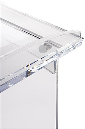 Featuring curved panels, this frosted portable lectern totes a modern design that is sure to convey a sleek and professional appearance. The floor standing acrylic podium ships flat and assembles quickly for easy transportation. The opaque portable lectern front and side panels offer a clean style that fits in well with any environment. The tabletop on this acrylic podium also features a raised edge to prevent notes, laptops, and other belongings from falling. Silver standoffs hold the panels together for quick assembly without the hassle of tools. This podium’s floor standing style was designed completely in house for a dependable lectern that will last!