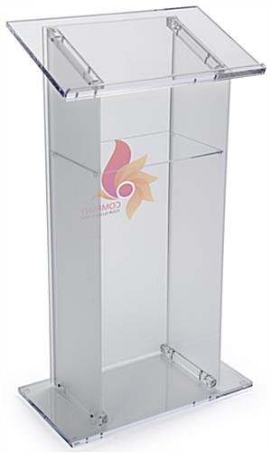 Showcase your logo or company design in high resolution with full color on this branded lectern podium. Custom graphics can be created on any computer by downloading the templates found below and sending them in once completed. The frosted lectern podium has a contemporary design that allows for privacy while presenting. An included shelf offers room to store notes, drinks, or reading materials out of view. Rubber feet on the base of the unit keep it from slipping or sliding on floors while also preventing scuffs or scrapes. We’ll print your custom graphic designs on this lectern podium to help you stand out from the crowd and wow your audience.