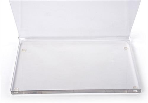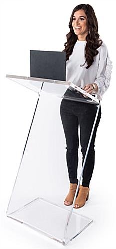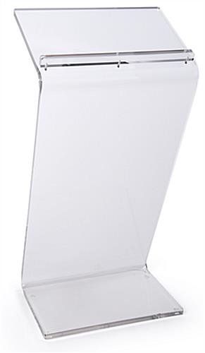 Our clear acrylic Z-shape podium is constructed with 1” thick material to create a solid structure that will look amazing in any professional, corporate, or church environment. The discreet but sleek transparent design of the diamond-like transparent lectern will allow you and your presentation to be the main focus of your event. This acrylic Z-shape podium with rubber floor protectors features a carefully designed reading lip that allows the speaker to confidently place laptops, notes, or other accesories. This transparent pulpit ships completely assembled to avoid a stressful and lengthy set-up process. We’ve carefully designed this lectern to ensure the base is extremely stable to guarantee a wobble-free presentation. Express your voice and present your ideas in a new way at a church, business or private event through this Z-shape podium designed to make you stand out.