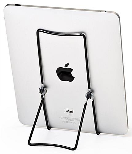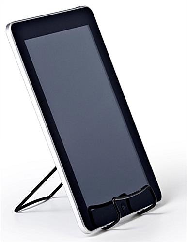 The budget iPad stand features a foldable design. The two support legs come in short and long lengths, depending on your application. Use the longer leg of the budget iPad stand for portrait format. The shorter leg is recommended for landscape use, or you can even bend both legs in the down position to achieve the lowest height. You have the freedom to bend the tablet mount into any configuration. The budget iPad stand that folds flat can be tucked away in a bag or drawer. This tablet holder accessory is constructed with a wire frame which is coated in black nylon plastic. This prevents scrapes or scratches on your investment. Due to its low price, this cheap iPad stand is sold in sets of 12 units. Buy a couple for yourself and give the rest as gifts to family and friends!