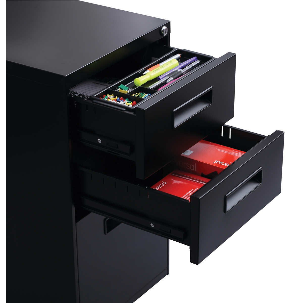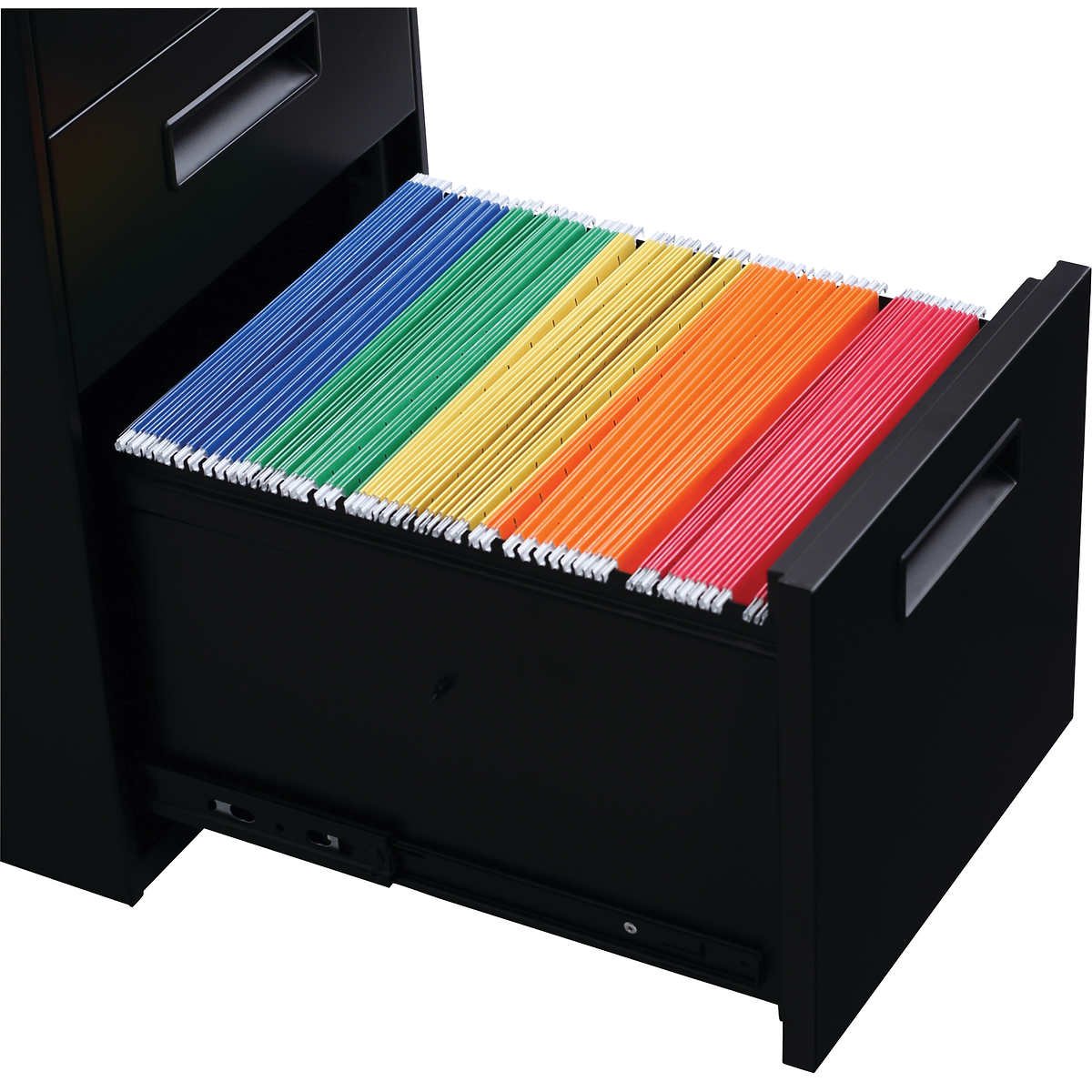 - Steel ball bearing slide suspension with 3/4 extension on box drawers and full-length extension on file drawers