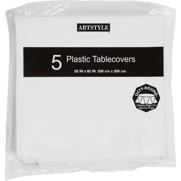 Artstyle Octy-Round Plastic Table Cover, 82″W x 82″L, White, 5 ct