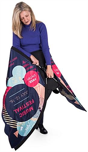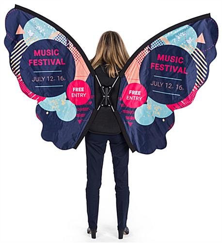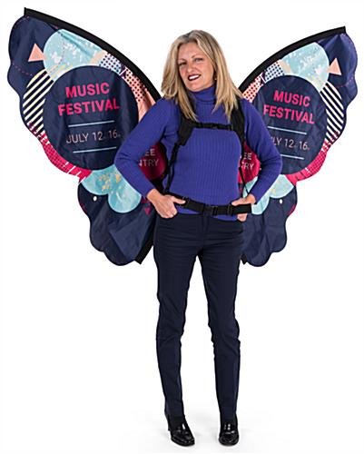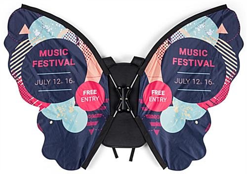 This walking butterfly backpack advertising banner makes a great portable promotional banner at an event! Each monarch style wing flag features double-sided custom graphics. The walking butterfly backpack advertising promotional banner set is perfect for staff to travel through the crowd at an event. Each custom printed wing shaped flag offers a unique branding opportunity. Adjustable straps, a side pocket and a lightweight design allow your staff to be comfortable as they travel through an event with the promotional banner. This walking butterfly backpack advertising set is sure to bring recognition to your brand at the next event!
