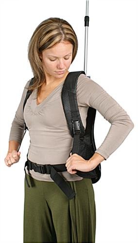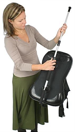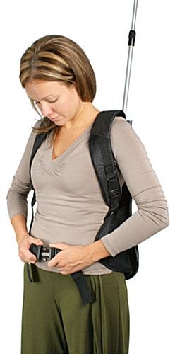 This walking flag backpack set is perfect for making an outdoor or indoor advertising impression on the go. A double-sided 48” custom billboard banner provides ample space for your marketing message. Digital dye sublimation printing on this walking flag backpack ensures that your full-color graphics will stand out in a crowd. The adjustable straps allow any user to comfortably carry this custom outdoor or indoor advertising banner. Once worn, this kit transforms into an eye-catching 48” tall portable marketing billboard. Use this flag backpack set to capture the attention of event attendees!