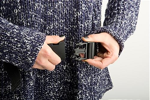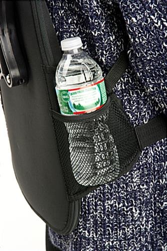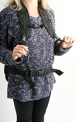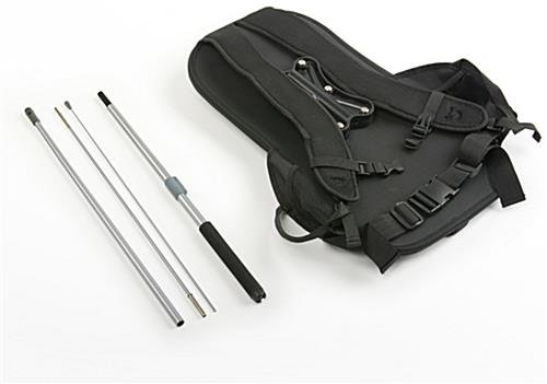 This walking banner is designed to hold a fabric advertisement that measures approximately 16.5” x 31” (not included.) The human billboard fits like a regular knapsack, resting comfortably on an individual’s back. Padded straps and front buckles create a comfortable positioning that allows users to easily walk around and interact with potential customers and clients. This walking banner is even equipped with zippered pockets in which users can store handouts and other marketing materials. There are also 2 mesh side pockets that are large enough to accommodate water bottles. This walking banner is easy to assemble and gives users the ability to incorporate advertisements into any promotional campaign.