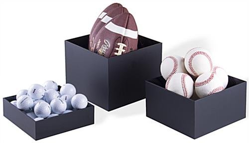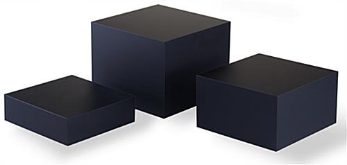 This black acrylic cube set is a great way to present your retail items instead of traditional display cases. The set of 3 sizes provides ample surface area for showcasing different merchandise either on top of, or inside of the hollow boxes. Use the nesting set of 3 display risers in both commercial and residential settings, or anywhere you need to present items in a stunning, aesthetically pleasing way! Stack them, stagger them, or turn them upside down and fill them – these boxes are so versatile the design possibilities are endless! The cube set has a matte finish and is 3mm thick for durability. Place them together or separately- each of the display risers fits inside of another creating endless ways to accessorize your merchandise. The cube set shown here is perfect for showcasing products on store shelves, retail counters, or with “impulse buys” at checkout.