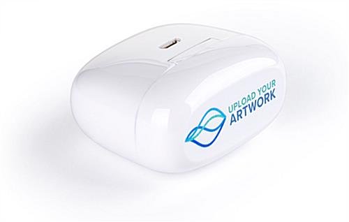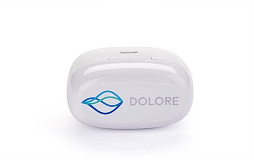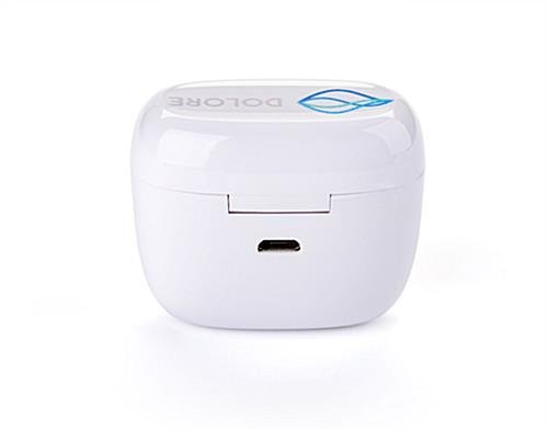 Our premium promotional wireless earphone buds with free full-color printing allow you to place your company logo or personalized message directly on the magnetic case. The custom order Bluetooth earbuds are great for wedding favors, groomsman’s gifts, swag bags, company giveaways, or corporate parties. These cool branded promotional wireless earphone buds with personalized graphics feature hands-free controls including volume, songs, and voice assistance. The custom order earbuds support 5 hours of talk and music time and have a Bluetooth range of up to 30 feet. A 500 mAh battery powers the magnetic charging box and charges the audio speakers in less than 2 hours. The promotional wireless earphone buds are gift-giving ready and ship in a beautiful non-branded gift box and include a micro cable USB cord for charging.